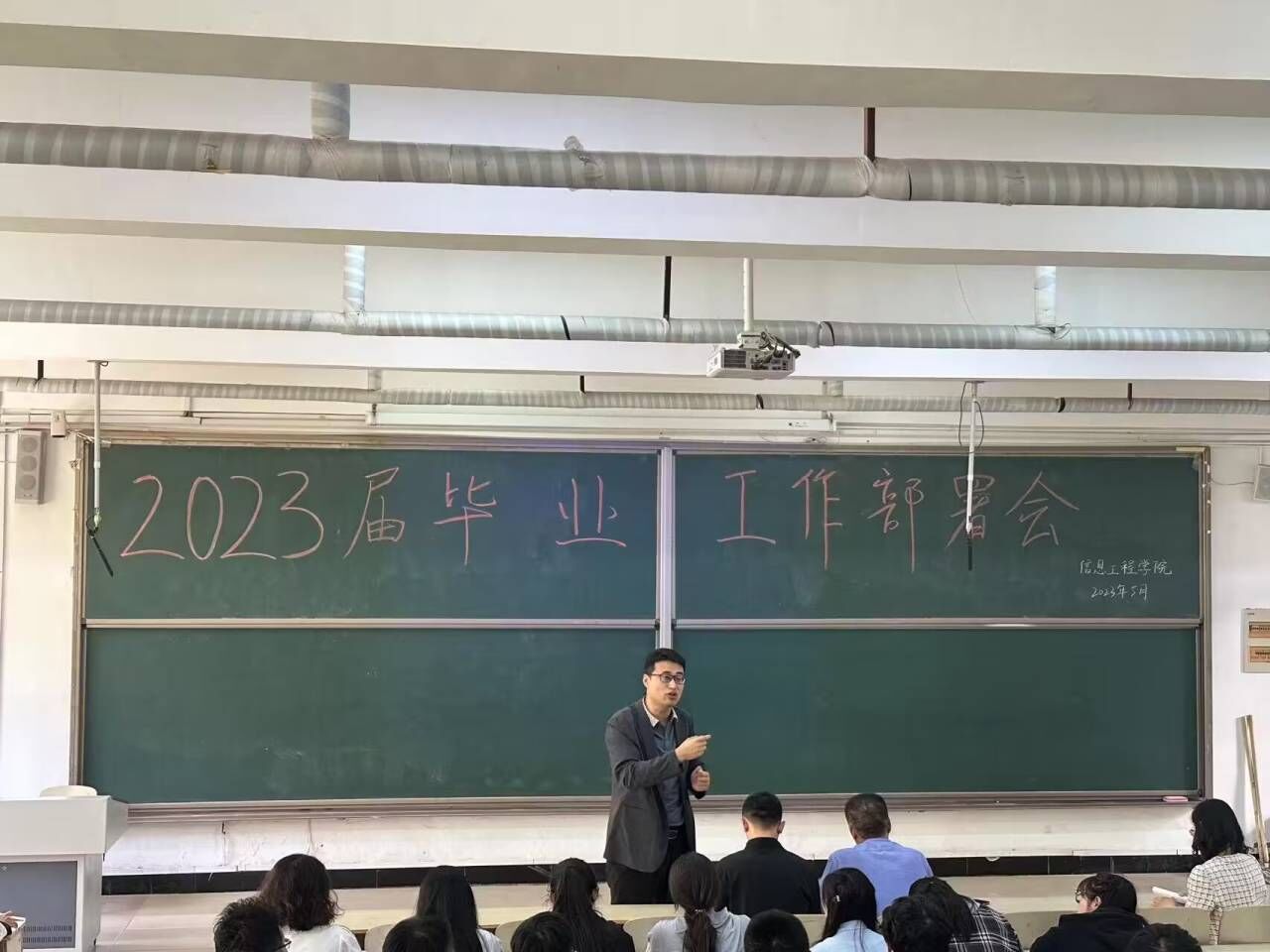 会议伊始,刘超、褚亮辉老师详细介绍了学院2023届毕业生目前的就业状况,并对近两年来同期就业数据进行了对比分析,让毕业生们在就业方面有了更好的了解,降低了心理压力。随后,王书记强调,就业指导工作是人才培养的落脚点,是人才培养的一个重要的评价指标,全院上下要始终把就业工作摆在各项工作的突出位置,不断强化校企合作,以更大的决心,更实的举措,强化责任担当,多措并举做好就业服务保障工作,持续拓宽毕业生实习就业渠道,千方百计促进毕业生更加充分、更高质量就业。最后,参会人员对今年就业形式及学院2023届毕业生离校前的相关注意事项展开了热烈讨论。