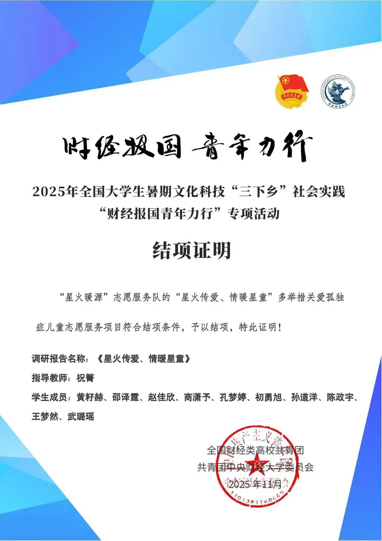 经主办方严格审核结项材料,“星火传爱、情暖星童”志愿服务项目顺利通过 2025 年全国大学生暑期“三下乡”社会实践“财经报国青年力行”专项活动结项验收。项目不仅为孤独症儿童送去精准关怀,为特殊教育机构提供了创新服务思路,更获得中国搜索等多家权威媒体报道,累计阅读量超 300 万次,显著提升了社会对孤独症群体的关注与重视。